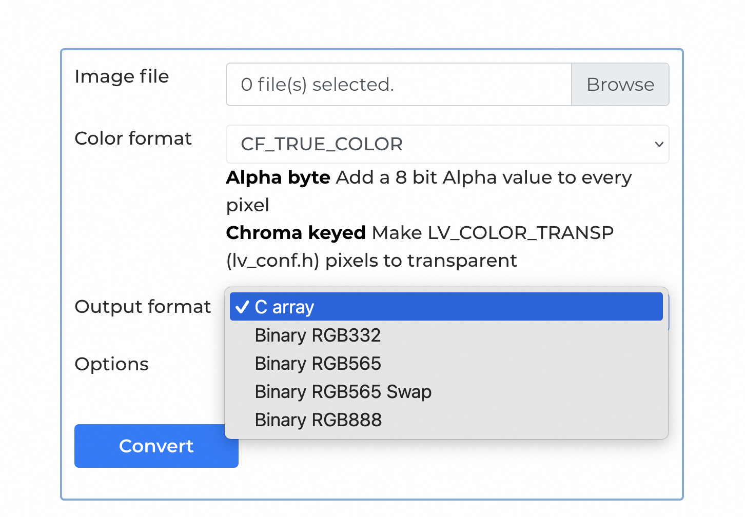 To use external files, you also need to convert the image files using the online converter tool but now you should select the binary output format. You also need to use LVGL’s file system module and register a driver with some functions for the basic file operation. Go to the File system to learn more. To set an image sourced from a file, use lv_img_set_src(img, “S:folder1/my_img.bin”).