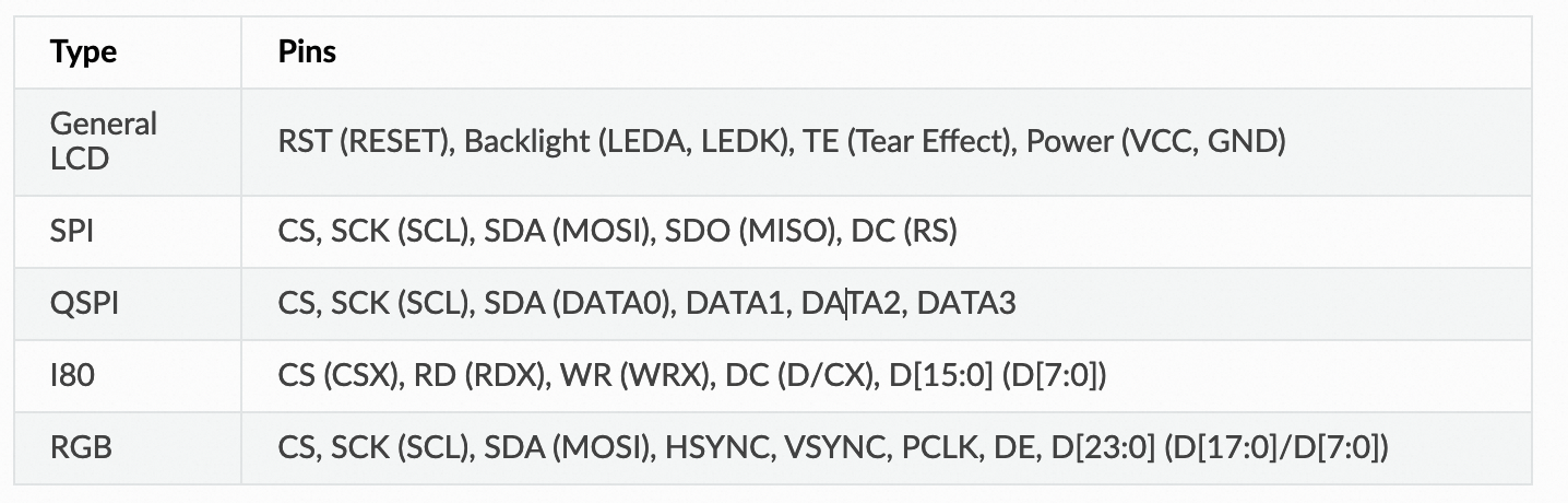 - MIPI-DSI:1/2/3/4 bit 串行接口,使用高速差分信号和 D-PHY 收发器(类似于 USB),目前只有 ESP32-P4 支持。属于传输速率最快的接口