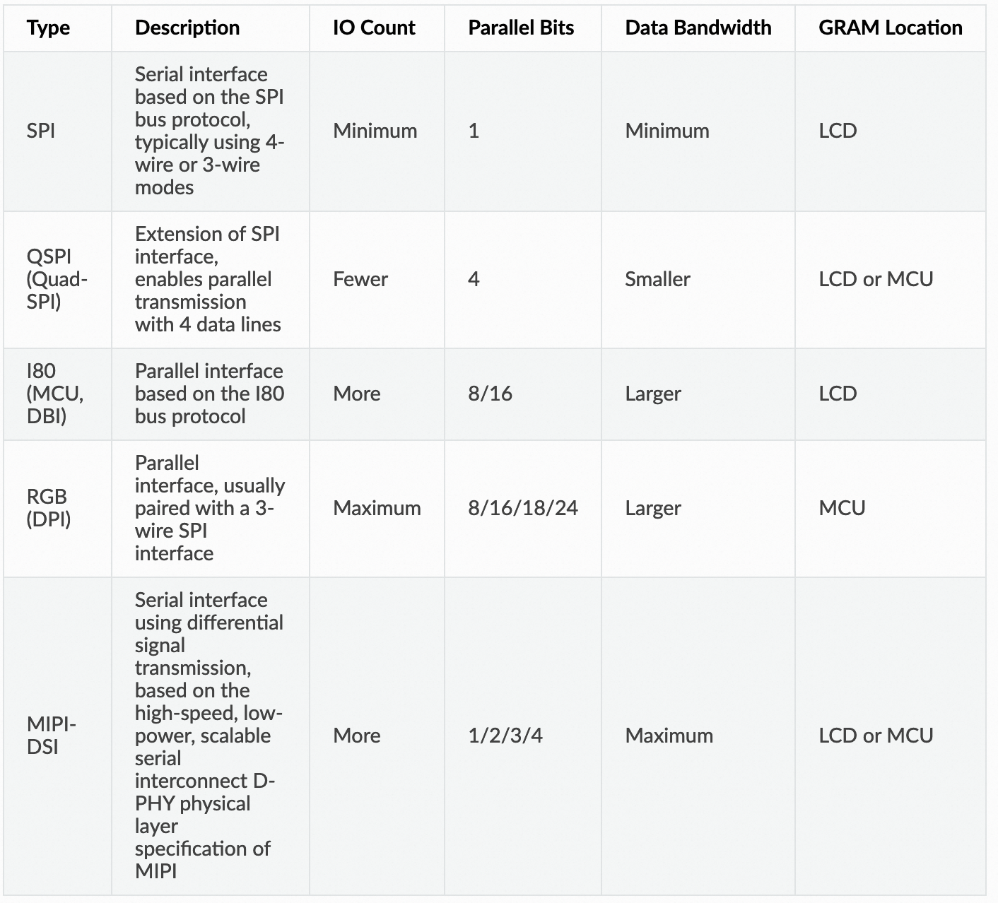 - QSPI(Quad-SPI):4 bit 数据线,LCD 或 MCU 需要支持 GRAM;